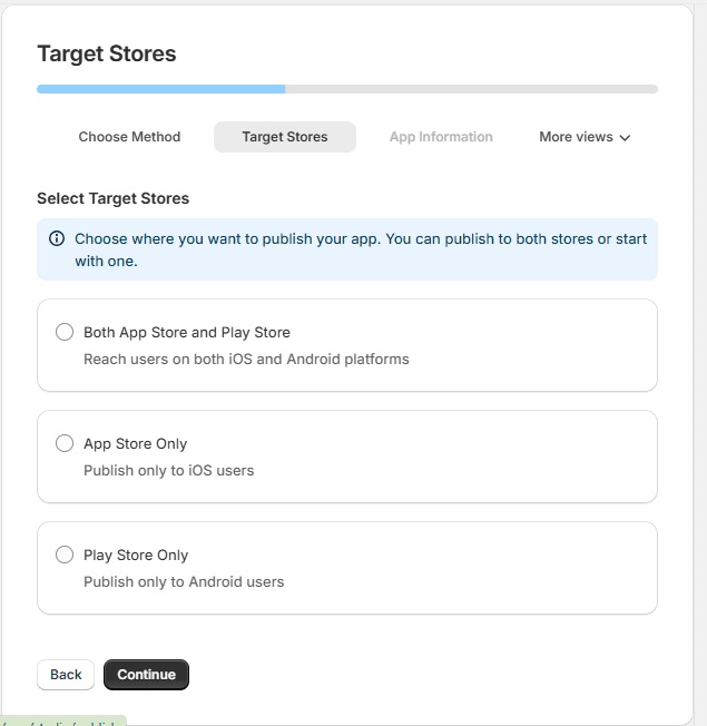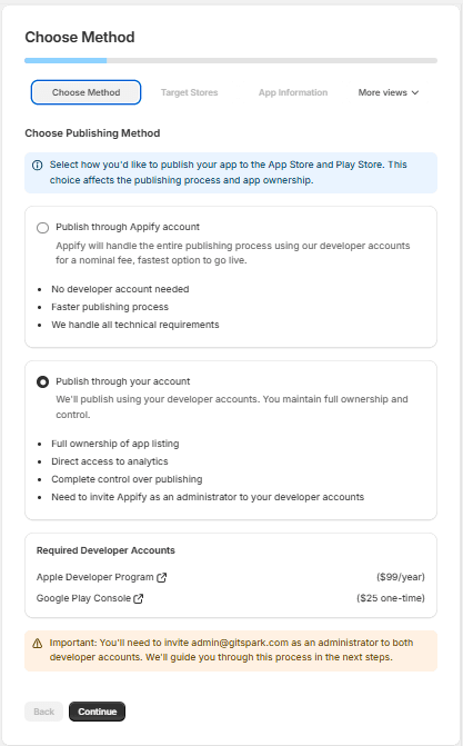 You'll need an Apple Developer Program ($99/year) and Google Play Console ($25 one-time). Select your preferred option and click Continue.
