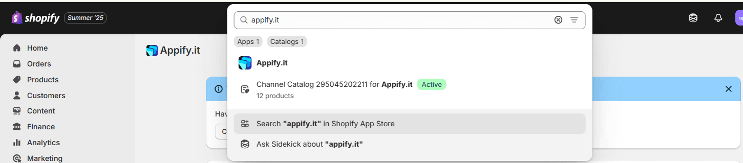 After installation, you'll find Appify.it conveniently located in the 'Sales Channels' section of your Shopify admin sidebar. Simply click on it to launch the app and start enhancing your store!