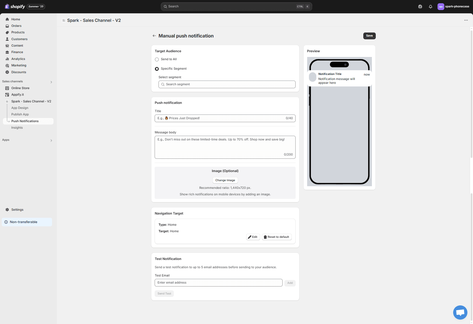 Push notifications are a powerful way to engage your mobile app users and drive conversions. With Spark, you can create both manual and automated push campaigns directly from your Shopify admin.